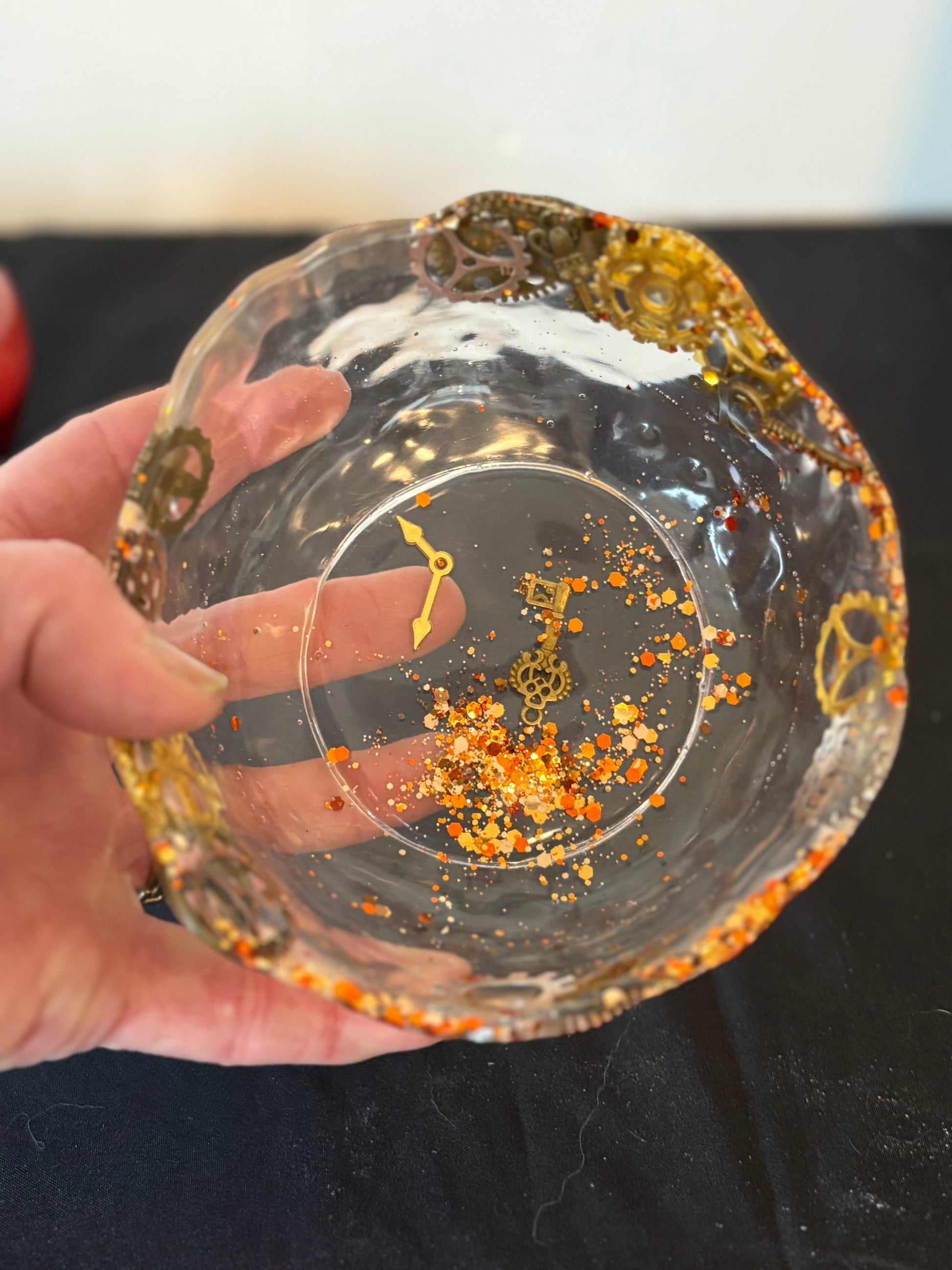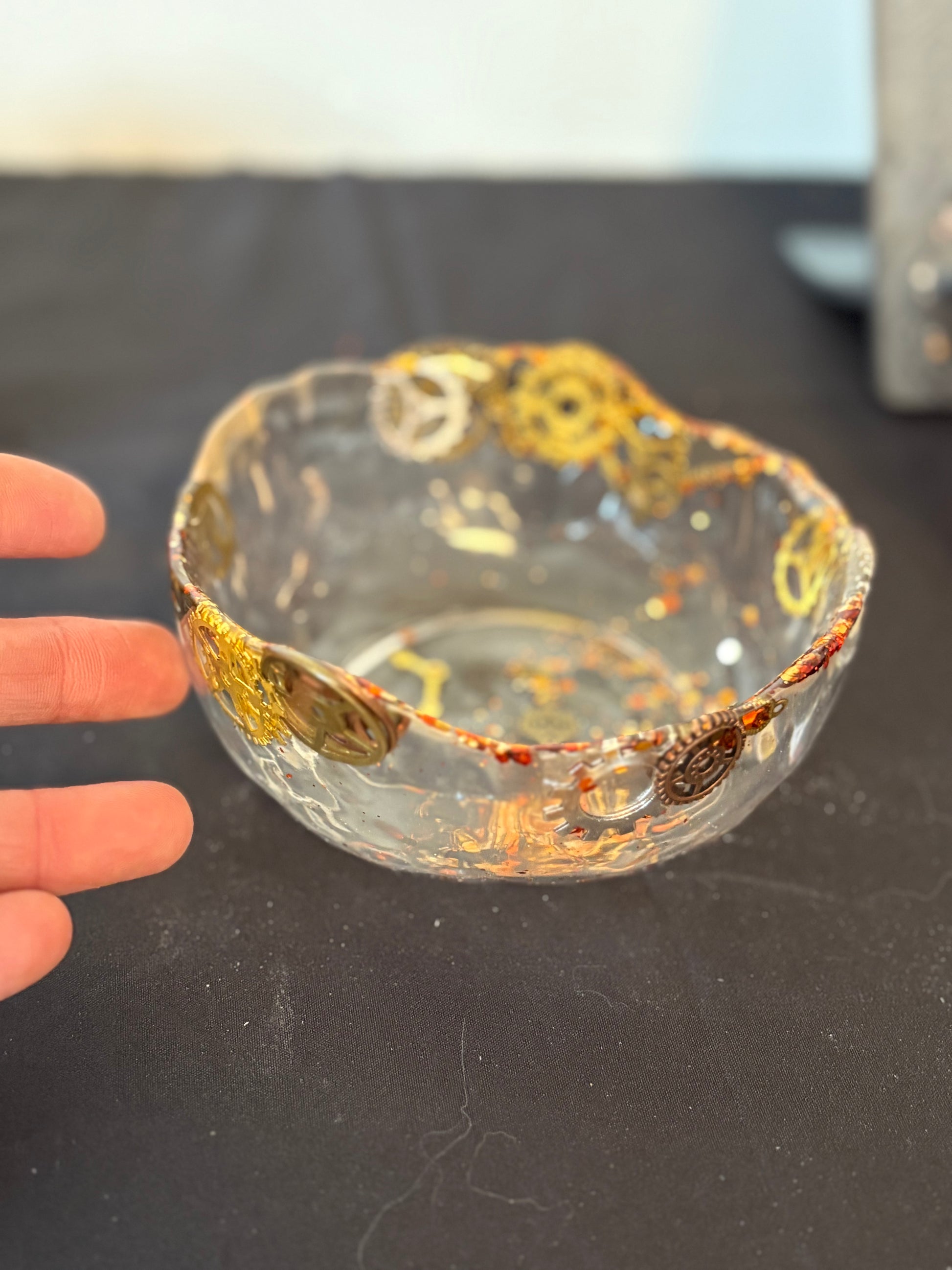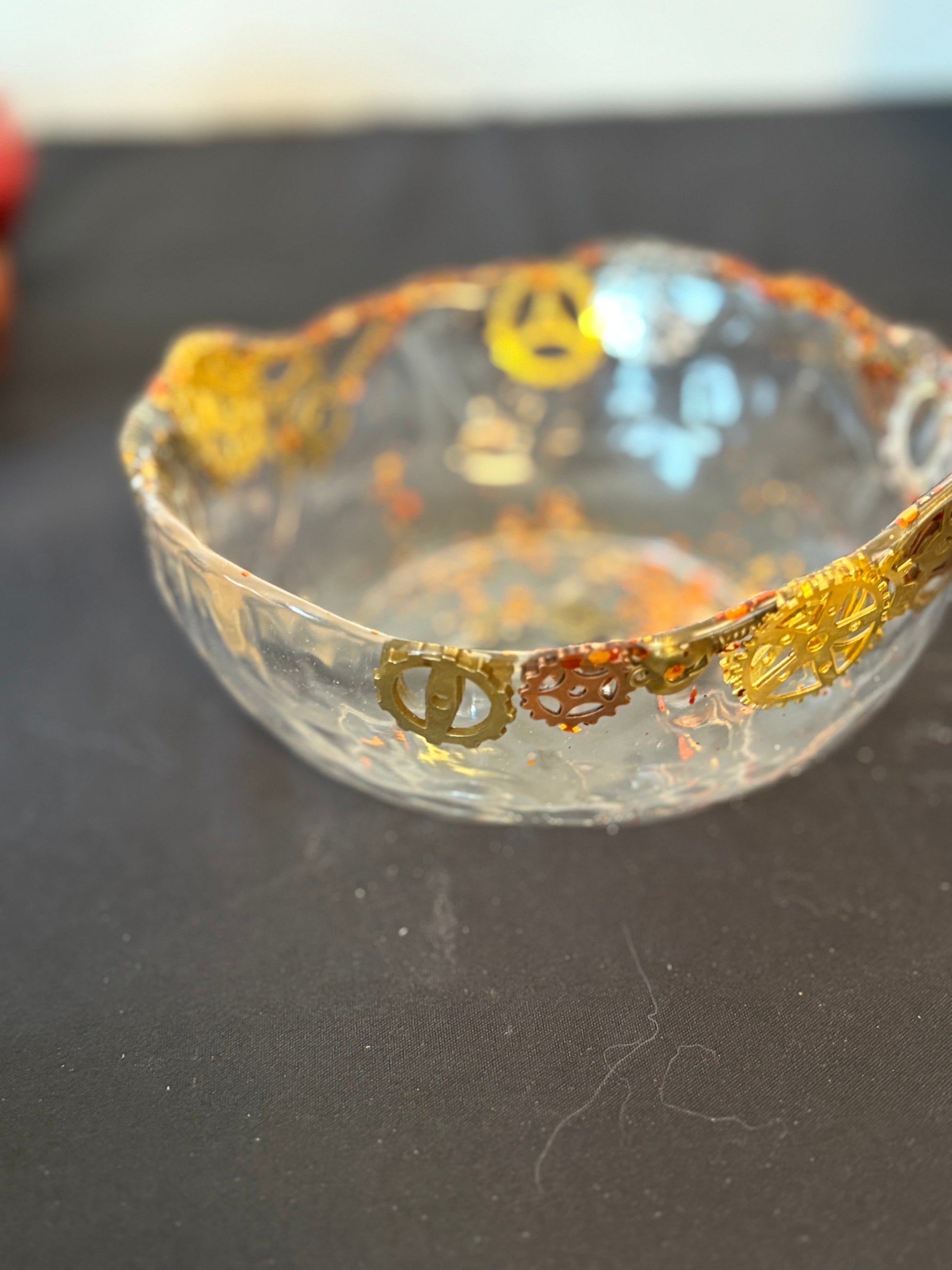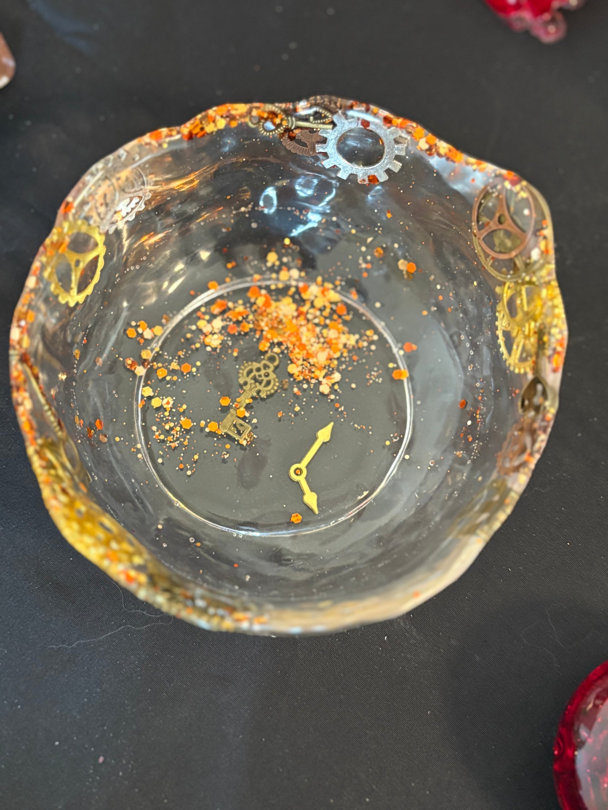 Bol en résine epoxy transparente, paillettes dorées , engrenages, clefs et aiguilles.