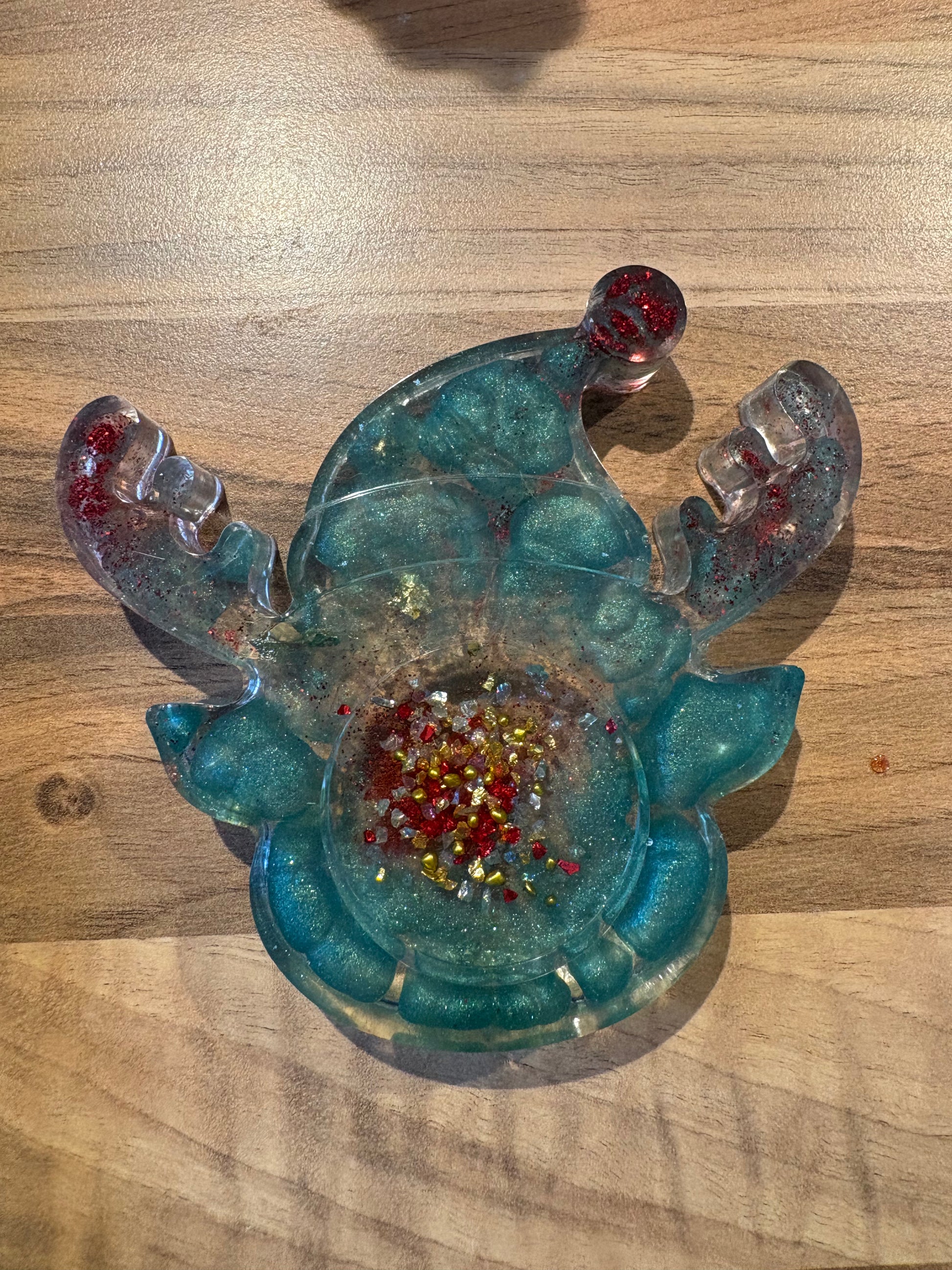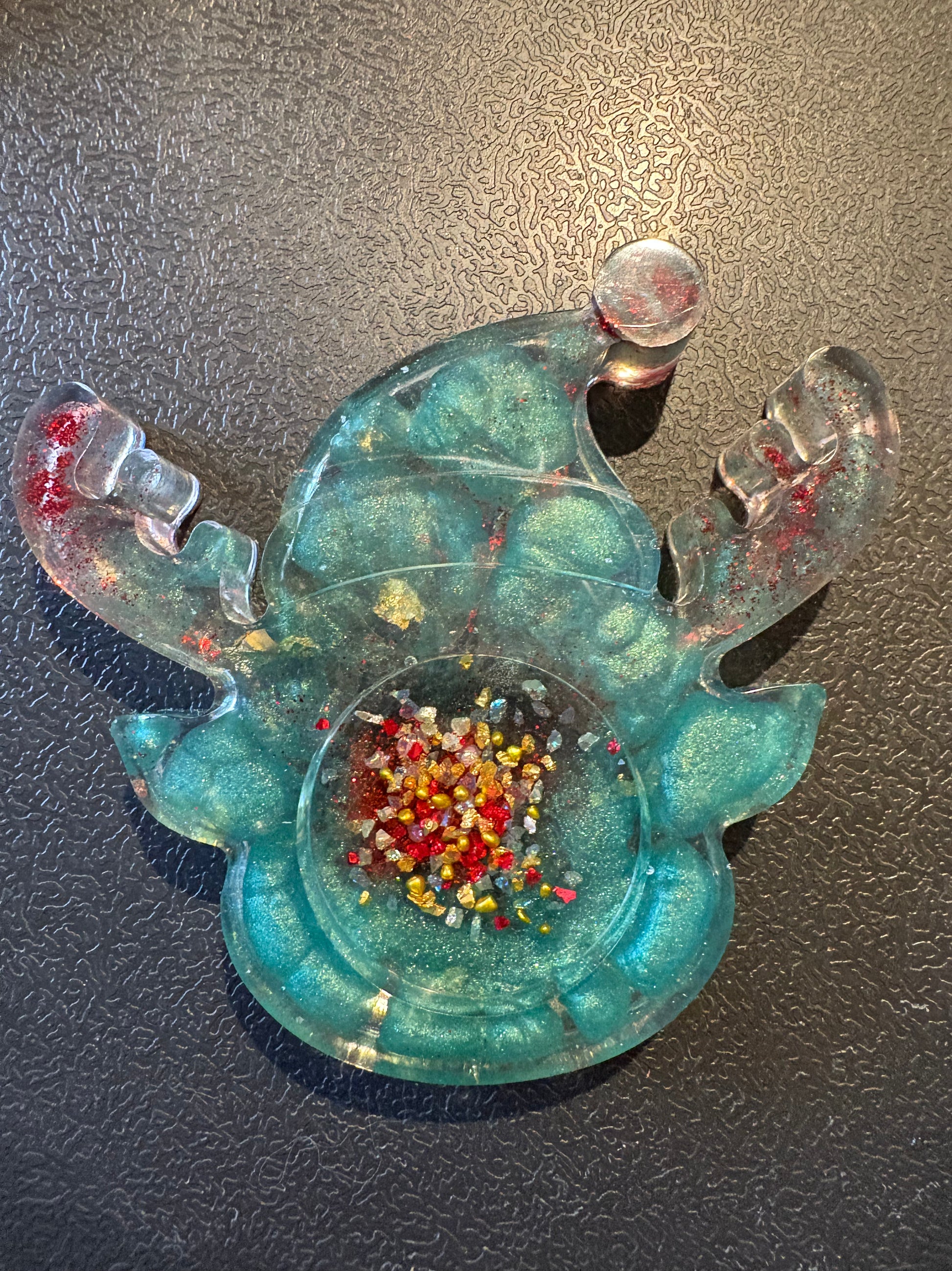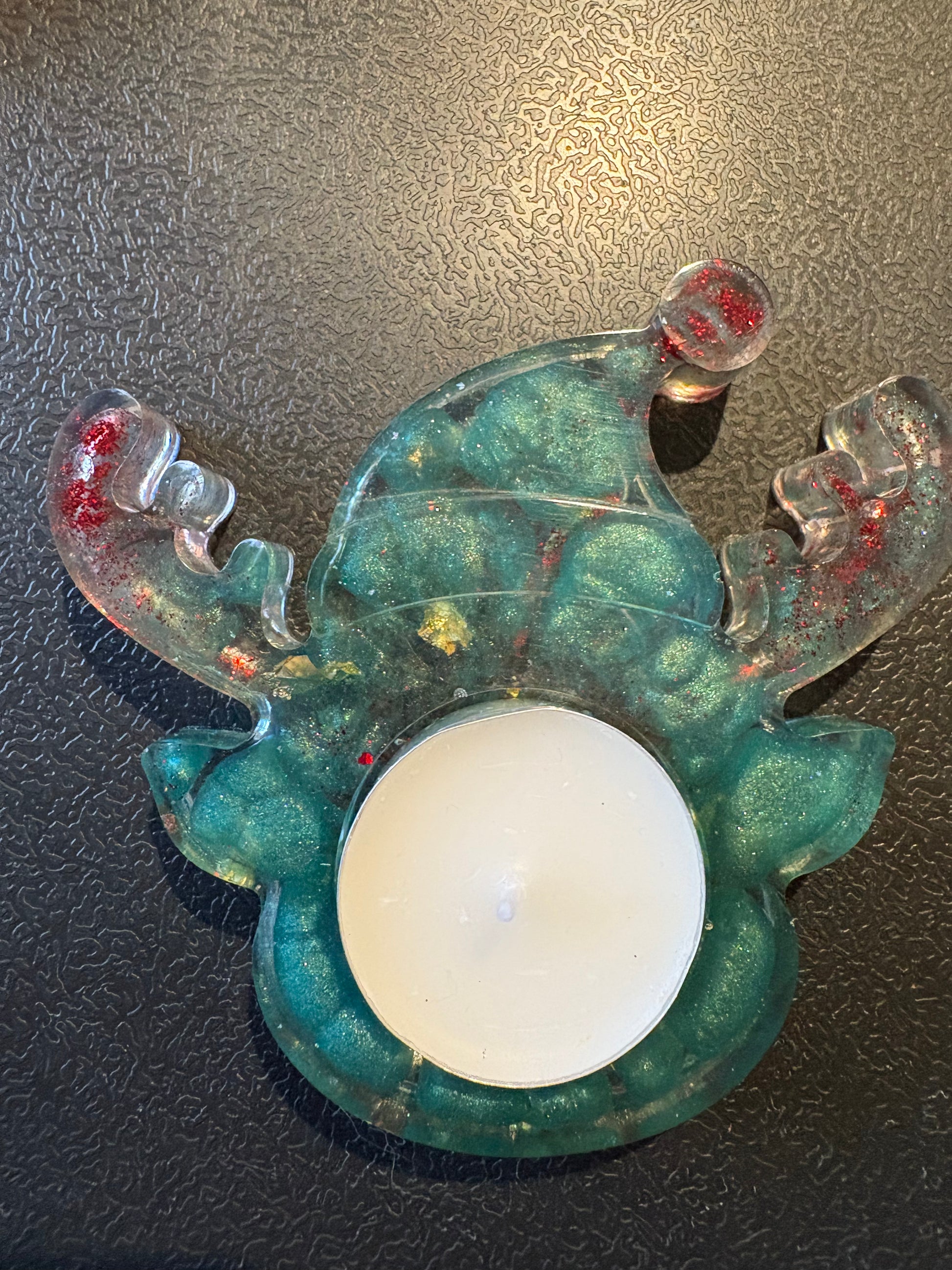 Bougeoir plat en forme de tête de gnôme dans les tons vert , transparent avec des paillettes .
