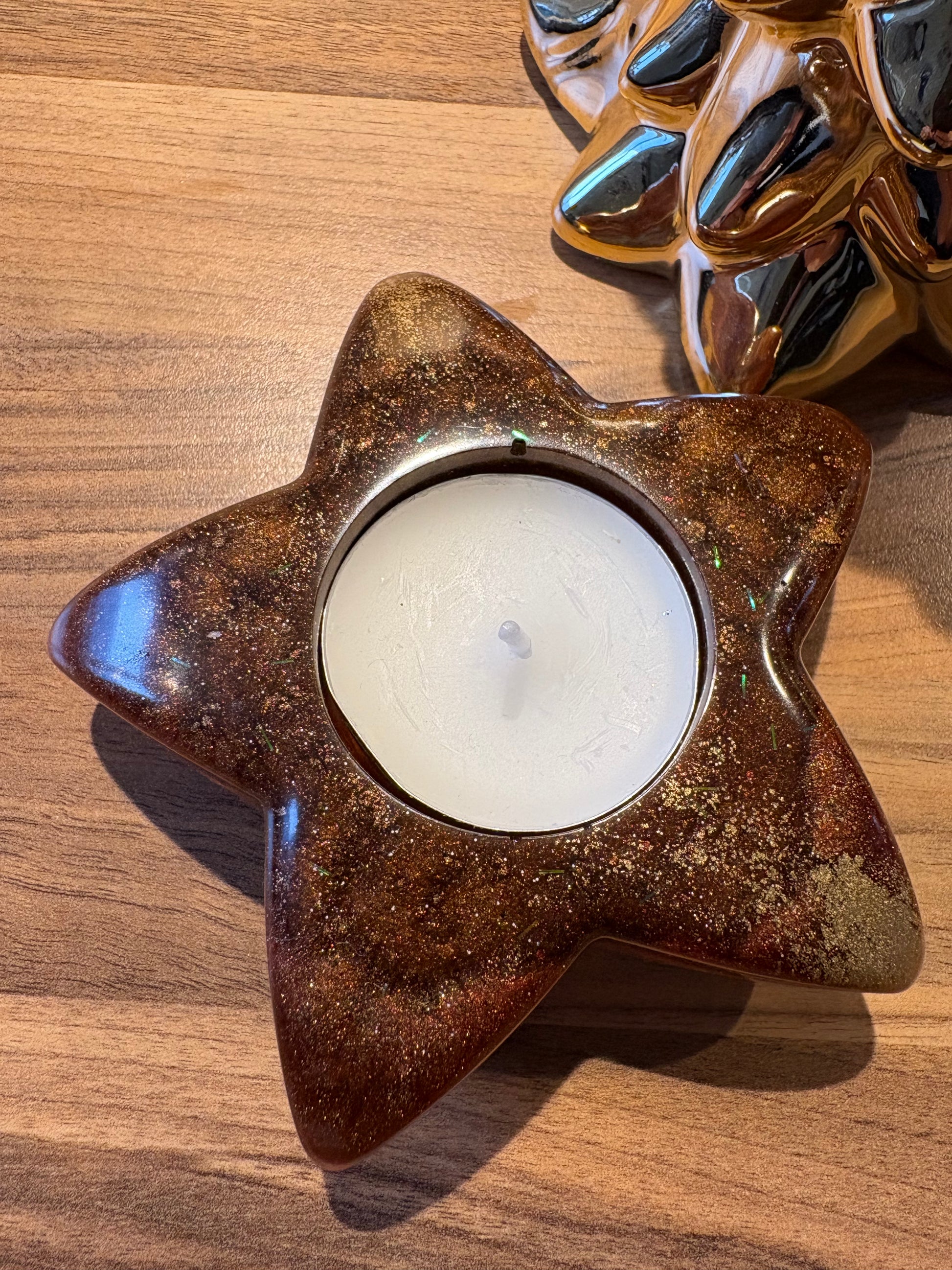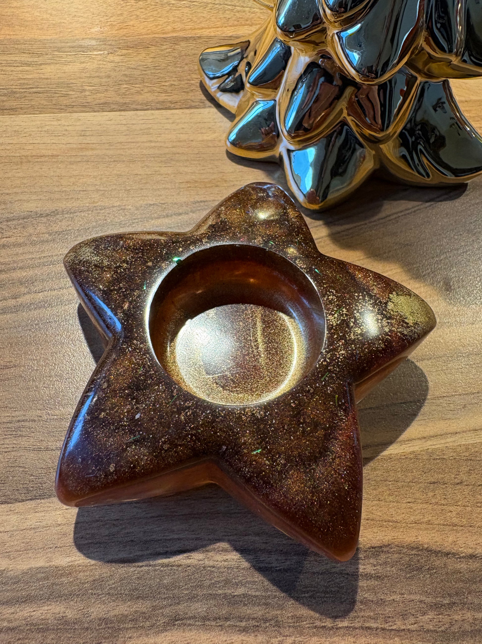 Bougeoir en forme d’étoile pour une bougie chauffe-plat dans les tons brun et doré .