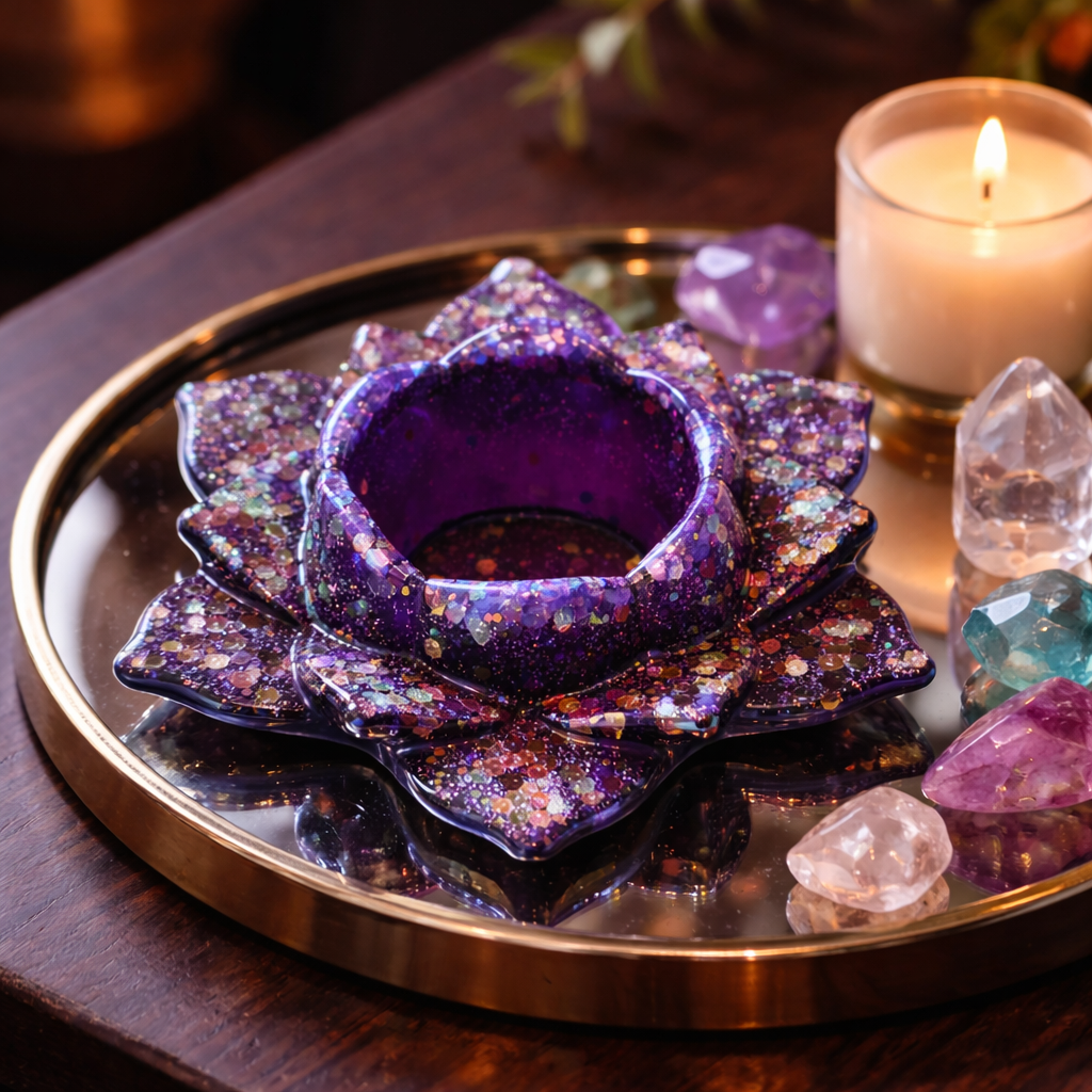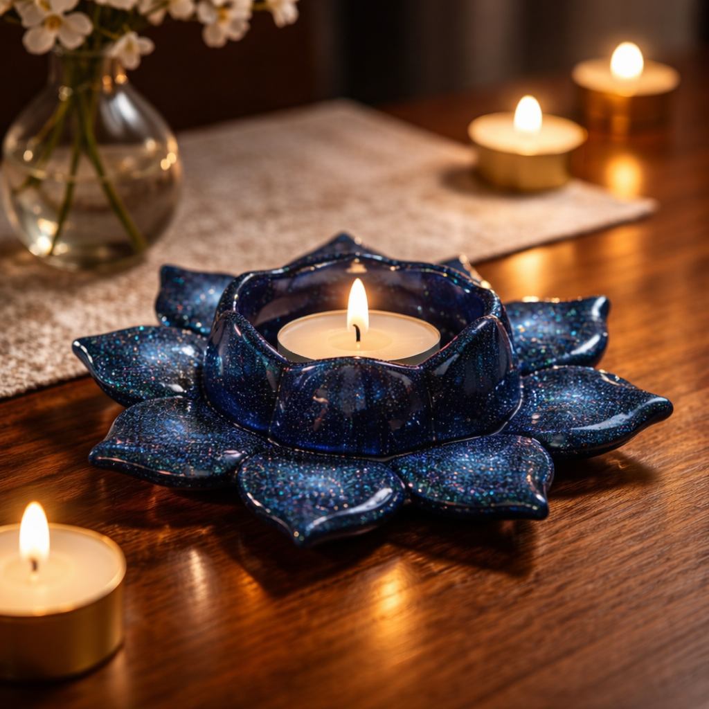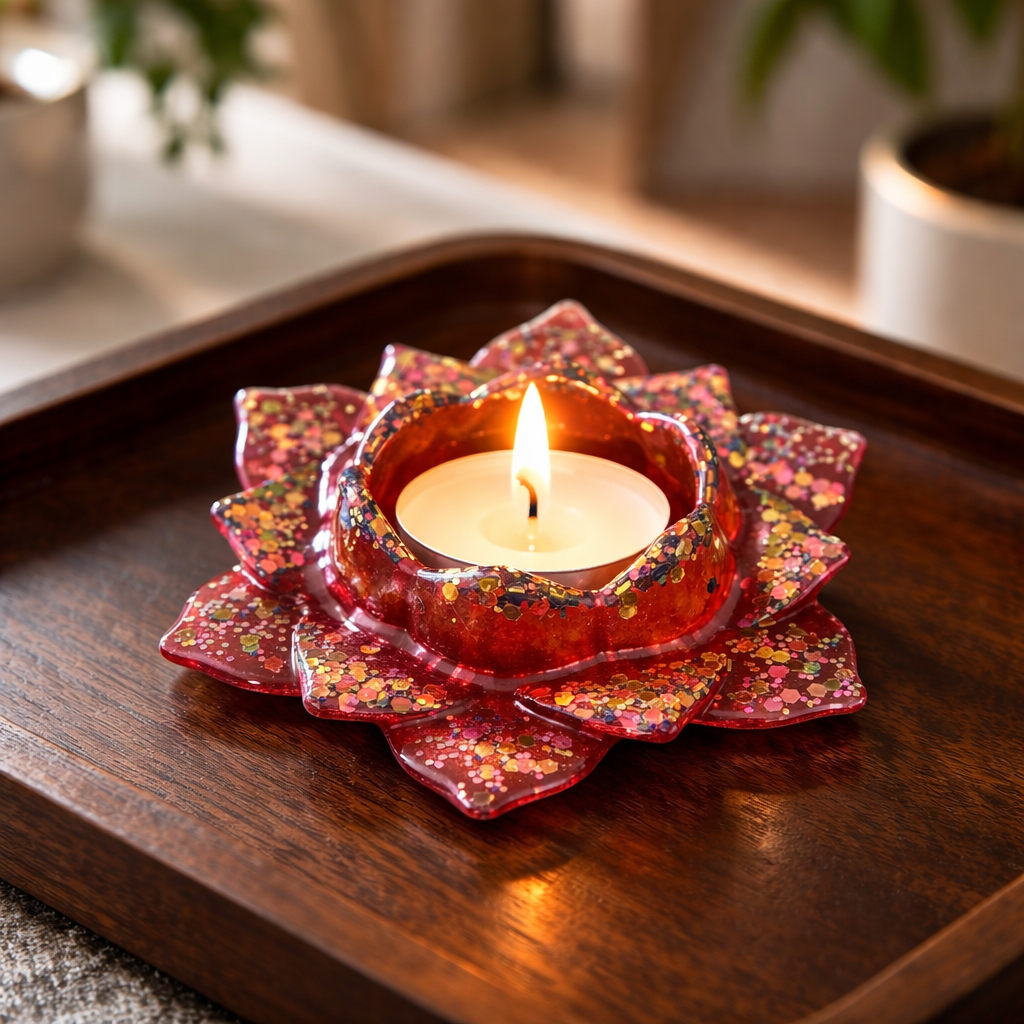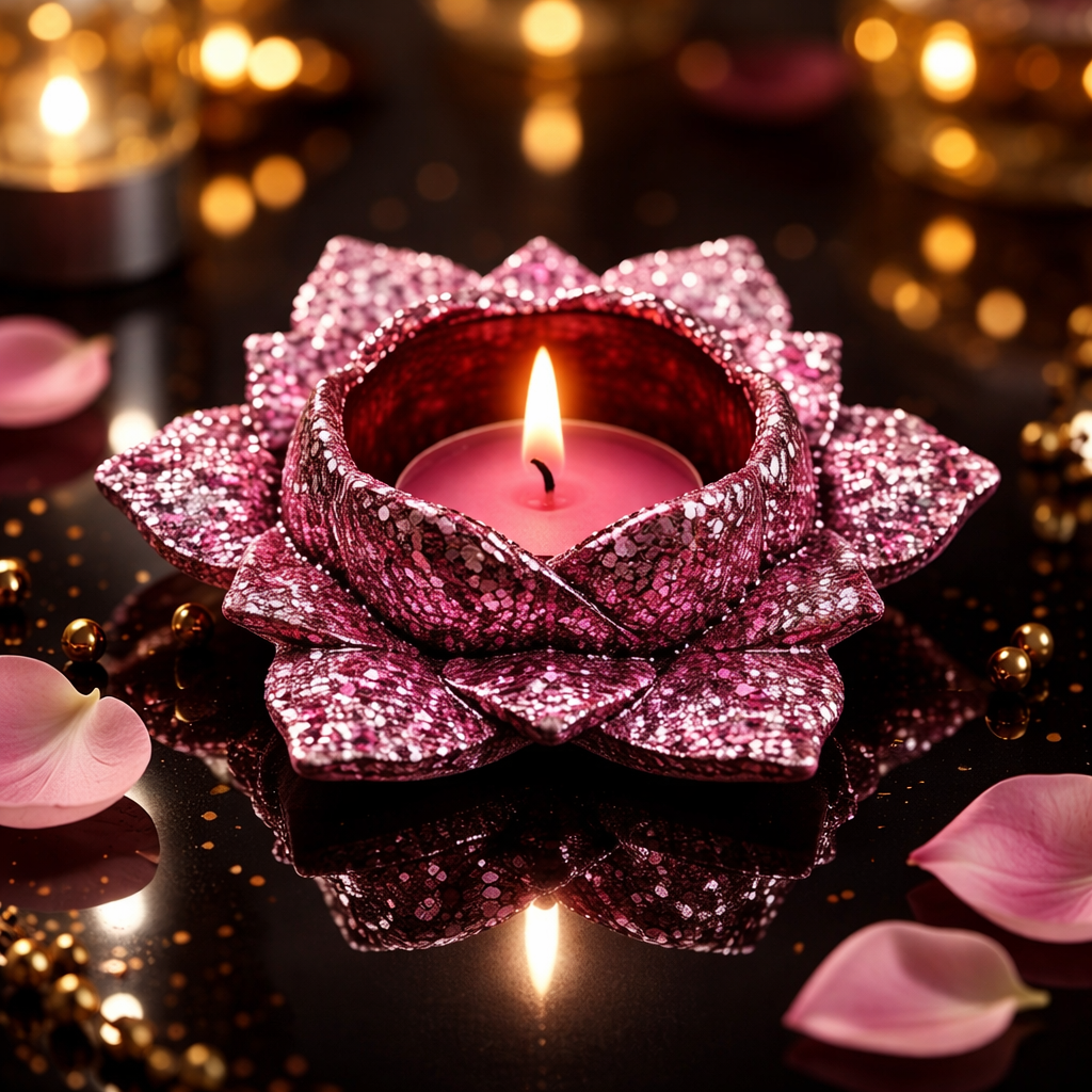 Bougeoir en forme de fleur de lotus dans les tons rouge cerise ou bleu ou Caramel ou violet … avec des paillettes pour bougie chauffe plat .