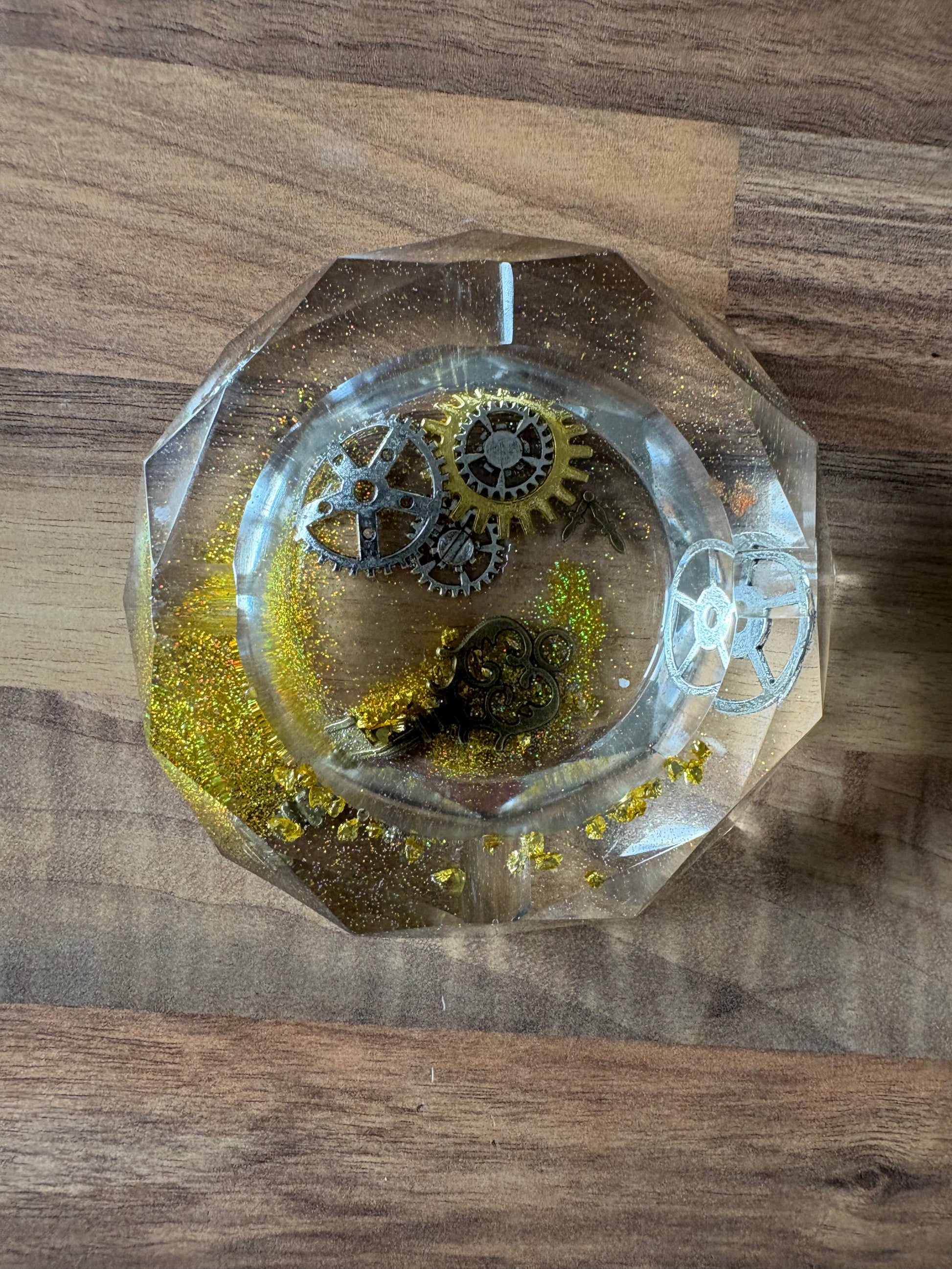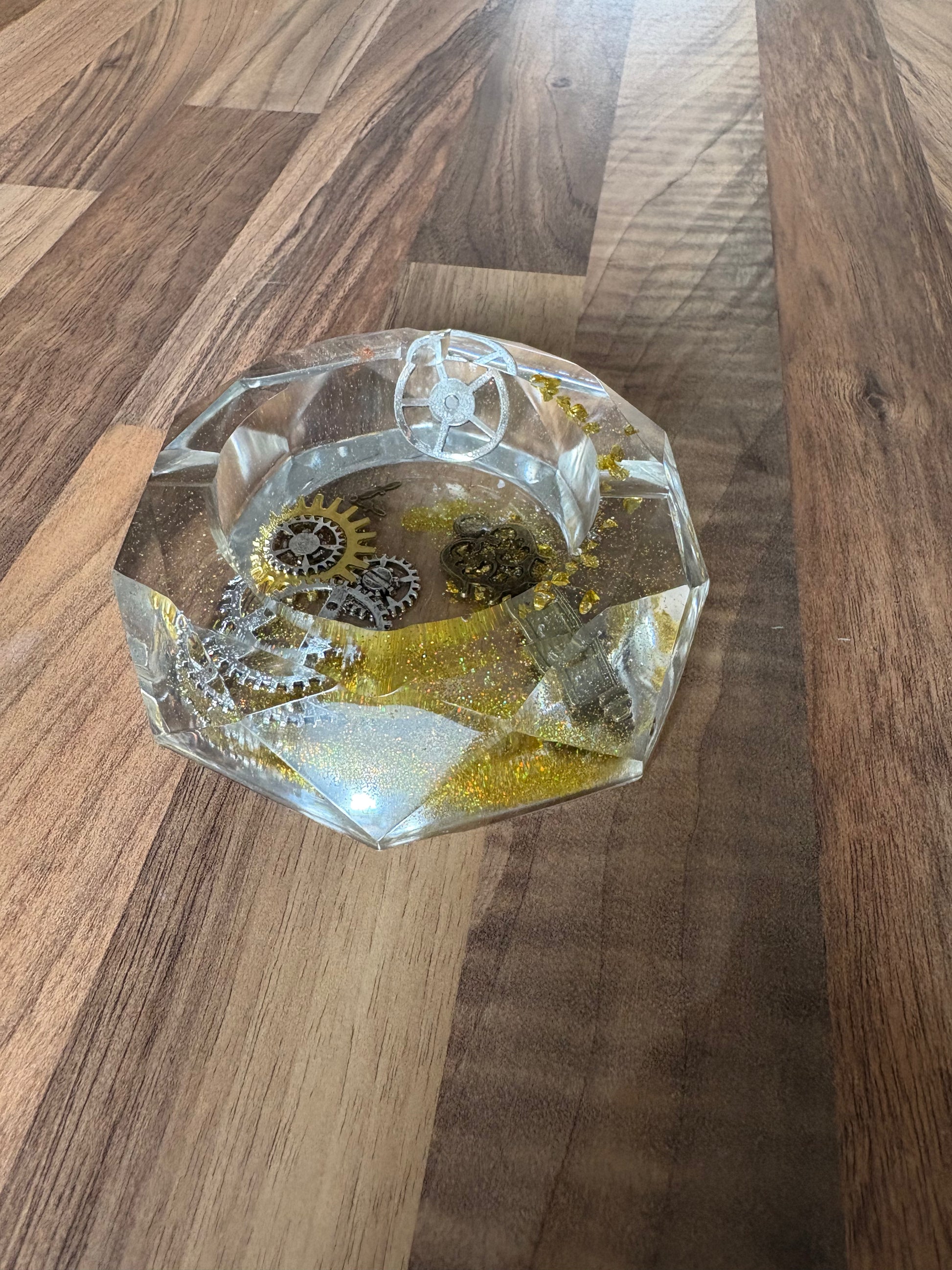 Cendrier de forme octogonale en résine transparente avec des paillettes dorées, de petits engrenages et une clef métalliques .