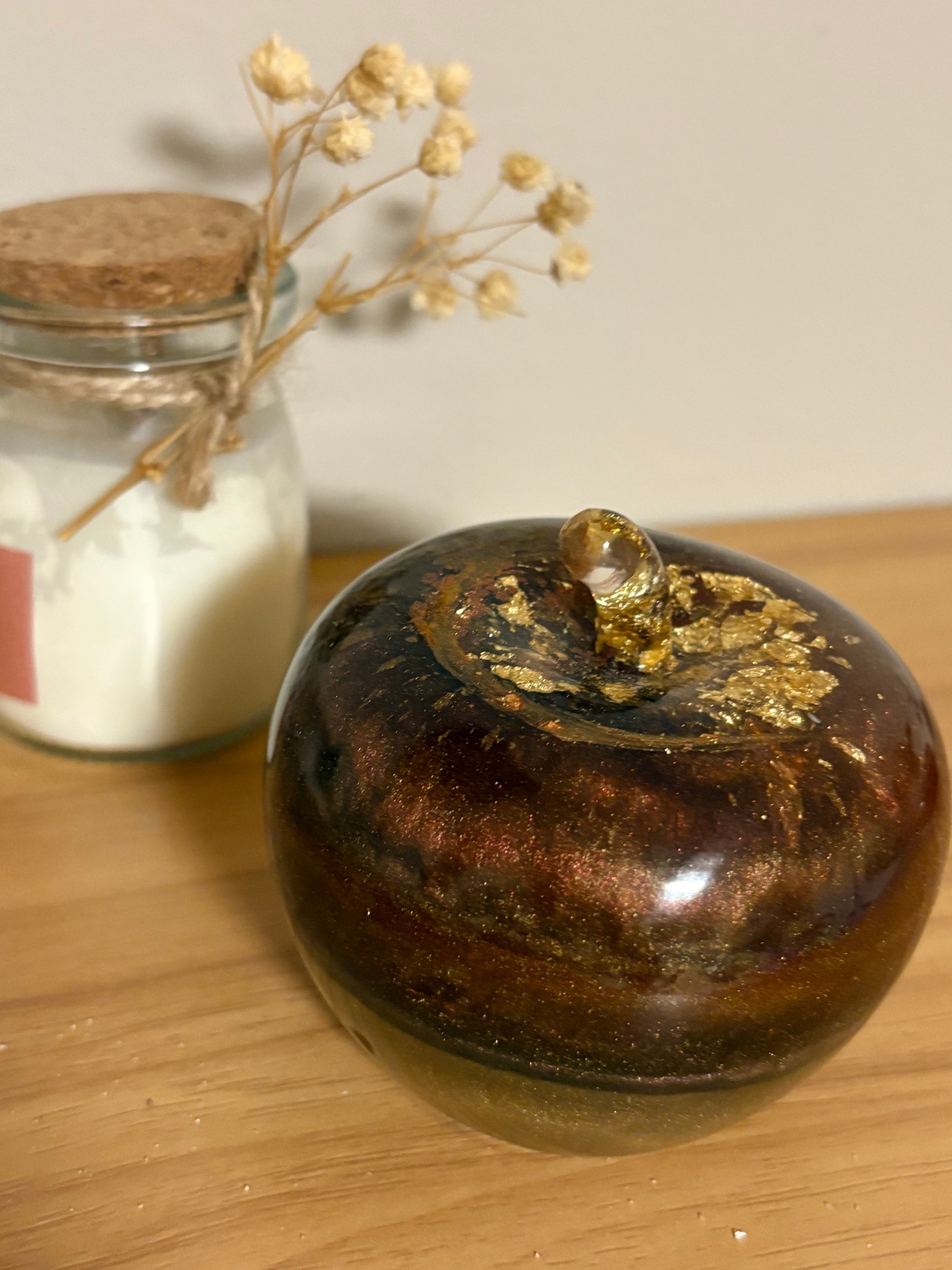 Pomme de décoration dans les tons bruns avec des morceaux de feuilles d’or .